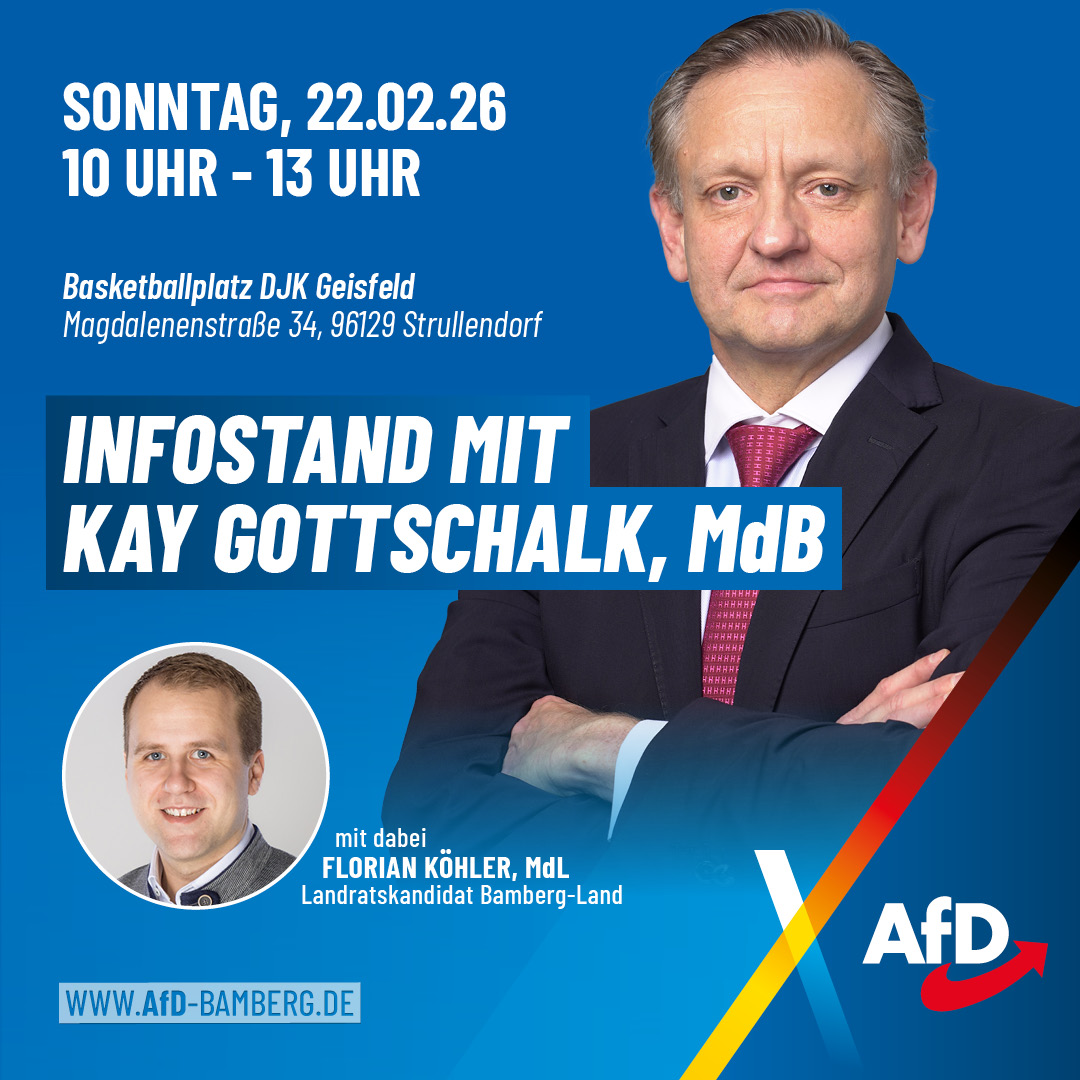 Besuchen Sie uns an unserem Infostand. Nutzen Sie die Gelegenheit, Ihre Anliegen direkt mit unseren Vertretern zu besprechen. Wir freuen uns auf Ihren Besuch! Ihre Gesprächspartner vor Ort: • Kay Gottschalk, MdB (Stellvertretender Bundessprecher der AfD) • Florian Köhler, MdL (Landratskandidat)
